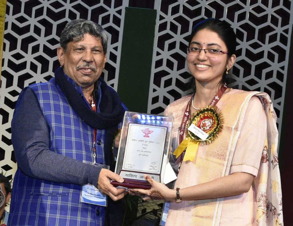 मुंबईच्या श्रुती कानिटकर यांना त्यांच्या संस्कृत भाषेतील ‘श्रीमतीचरित्रम्’ या काव्यसंग्रहासाठी ‘युवा साहित्य’ पुरस्कार प्रदान करण्यात आला. राधा-कृष्ण प्रेम हे सर्व परिचित आहे. कृष्णाबद्दल सर्वांना माहिती आहे. मात्र, राधाबद्दल कमी लोकांना माहिती असल्याचे श्रुती यांनी सांगितले. राधा या चरित्रावर प्रकाश टाकण्याचा प्रयत्न या काव्यसंग्रहात करण्यात आला आहे. हे काव्य सात विभागात आहे. प्रत्येक भागाला लीला असे नाव देण्यात आलेले आहे. यात प्रेमभक्ती व्यक्त करण्यात आली आहे, असे त्या म्हणाल्या.