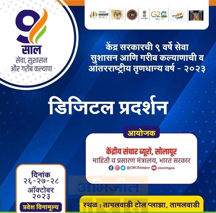 माहिती व प्रसारण मंत्रालयाच्या केंद्रीय संचार ब्यूरो, सोलापूर यांच्या वतीने कोजागरी पौर्णिमानिमित्त दिनांक 26 ते 28 ऑक्टोबर 2023 पर्यंत आंतरराष्ट्रीय पौष्टिक भरडधान्ये आणि केंद्र शासनाचे 9 वर्ष सेवा, सुशासन आणि गरीब कल्याण योजनांवर तामलवाडी टोल प्लाजा येथे तीन दिवसीय डिजिटल मल्टीमीडिया प्रदर्शनाचे आयोजन करण्यात आल्याची माहिती केंद्रीय संचार ब्युरोचे क्षेत्रीय प्रचार अधिकारी अंकुश चव्हाण यांनी दिली आहे.