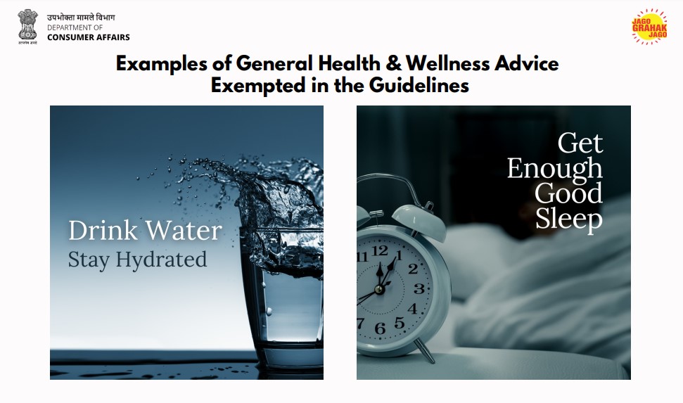 ‘पाणी प्या आणि हाइड्रेटेड राहा’, ‘नियमित व्यायाम करा आणि शारीरिकदृष्ट्या सक्रिय रहा’, ‘एकाच जागी जास्त वेळ बसणे आणि जास्त स्क्रीन पाहणे कमी करा’, ‘पुरेशी झोप घ्या’, ‘लवकर बरे होण्यासाठी हळद घातलेले दूध प्या’, हानिकारक अतिनील किरणांपासून बचावासाठी दररोज ‘सनस्क्रीनचा उपयोग करा’, ‘केसांच्या चांगल्या वाढीसाठी तेलाचा वापर करणे’ आदि सामान्य आरोग्य विषयक हितकारक सल्ले जे विशिष्ट उत्पादने किंवा सेवांशी सबंधित नाहीत अथवा विशिष्ट आरोग्य स्थिती, परिणामांना लक्ष्य करत नाहीत, त्यांना या नियमातून सूट दिली आहे.