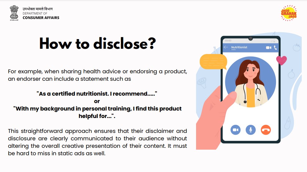 प्रसिद्ध व्यक्ती, प्रभावशाली आणि आभासी प्रभावकर्त्यांनी उत्पादने किंवा सेवांचा प्रचार करताना किंवा कोणतेही आरोग्य-संबंधित दावे करताना, स्वत:ला आरोग्य तज्ञ किंवा वैद्यकीय व्यावसायिक म्हणून सादर करताना, माहिती सामायिक करताना, स्पष्ट अस्वीकरण प्रदान करणे आवश्यक आहे ज्यानुसार प्रेक्षकांना स्पष्टपणे समजेल की त्यांचे समर्थन पर्याय म्हणून पाहिले जाऊ नये.