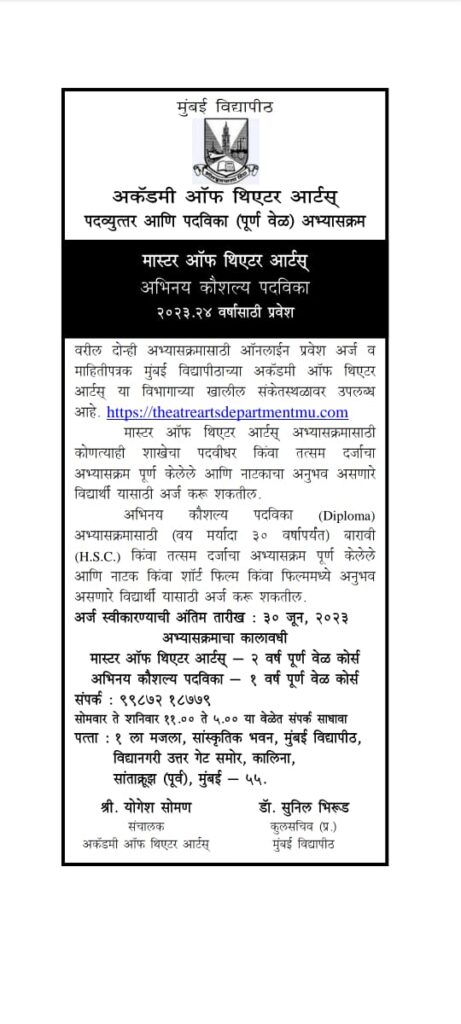 मुंबई विद्यापीठाच्या अकॅडमी ऑफ थिएटर आर्ट्सच्या पदव्युत्तर आणि पदविका (पूर्ण वेळ) अभ्यासक्रम, मास्टर ऑफ थिएटर आर्टस् अभिनय कौशल्य पदविका २०२३-२४ वर्षासाठी प्रवेशप्रक्रिया सुरू झाली आहे, अशी माहिती अकॅडमी ऑफ थिएटर आर्ट्सचे संचालक योगेश सोमण यांनी दिली आहे.
