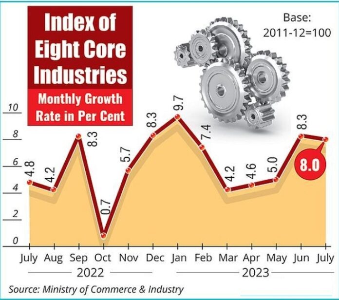 ऑगस्ट 2023 साठीच्या आठ प्रमुख उद्योगांच्या (तात्पुरत्या) निर्देशांकातील अंतिम वृद्धी दर 13.4 टक्क्यांपर्यंत पोहोचला आहे. एप्रिल ते नोव्हेंबर 2023-24 दरम्यान आयसीआयचा एकत्रित विकास दर मागील वर्षाच्या याच कालावधीच्या तुलनेत 8.6 टक्के (तात्पुरता) इतका आहे.