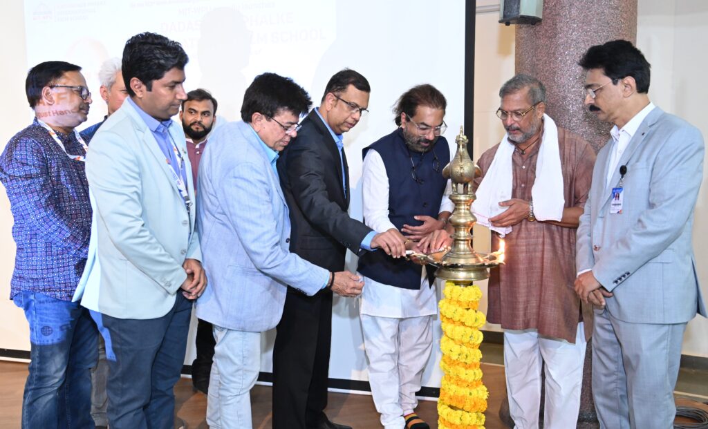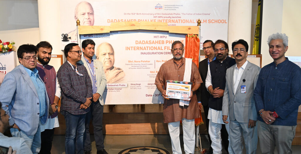 पुण्याच्या एमआयटी वर्ल्ड पीस युनिव्हर्सिटीतर्फे येत्या शैक्षणिक वर्षात नव्याने सुरू करण्यात आलेल्या ‘दादासाहेब फाळके इंटरनॅशनल फिल्म स्कूल’चे उद्घाटन अभिनेता नाना पाटेकर यांच्या हस्ते करण्यात आले. यावेळी ते बोलत होते. एमआयटी डब्ल्यूपीयूचे कुलगुरू डॉ. आर. एम. चिटणीस, संजय कामटेकर, प्रकुलगुरू डॉ. तपन पांडा, कुलसचिव गणेश पोकळे, प्रसिद्ध क्रिएटीव्ह डायरेक्टर अभिजित पानसे, धिरज सिंग व दूरदर्शनचे माजी संचालक मुकेश शर्मा आदी याप्रसंगी उपस्थित होते.