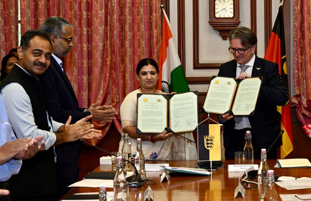 महाराष्ट्र आणि जर्मनीतल्या बाडेन-वुटेमबर्ग, या राज्यांदरम्यान नर्सिंग क्षेत्रातील सहकार्य दृढ करण्यासाठी संयुक्त करार झाला असून यामुळे महाराष्ट्रातल्या नर्सिंगच्या विद्यार्थ्यांना जर्मनीत प्रशिक्षण घेऊन करिअर करण्याची संधी उपलब्ध झाली आहे, अशी माहिती राज्याच्या वैद्यकीय शिक्षण राज्यमंत्री माधुरी मिसाळ यांनी नुकतीच दिली. माधुरी मिसाळ आणि बाडेन-वुटेमबर्ग राज्याचे मंत्री मॅनफ्रेड लुखा यांनी मुंबईतल्या सह्याद्री अतिथीगृहात याबाबतच्या संयुक्त जाहीरनाम्यावर सह्या केल्या. वैद्यकीय शिक्षण विभागाचे सचिव धीरजकुमार, वैद्यकीय शिक्षण आयुक्त डॉ. अनिल भंडारी, वैद्यकीय शिक्षण आणि संशोधन संचालनालयाचे संचालक डॉ. अजय चंदनवाले, वैद्यकीय शिक्षण विभागाच्या सहसचिव डॉ. सुवर्णा खरात, यांच्यासह अर्चना बडे, धीरेंद्र रामटेके, तसेच बाडेन-वुटेमबर्ग राज्य येथील सामाजिक व्यवहार, आरोग्य आणि एकात्मता मंत्रालयाचे उच्चस्तरीय प्रतिनिधी मंडळ तसेच वैद्यकीय शिक्षण विभागातील वरिष्ठ अधिकारी यावेळी उपस्थित होते.