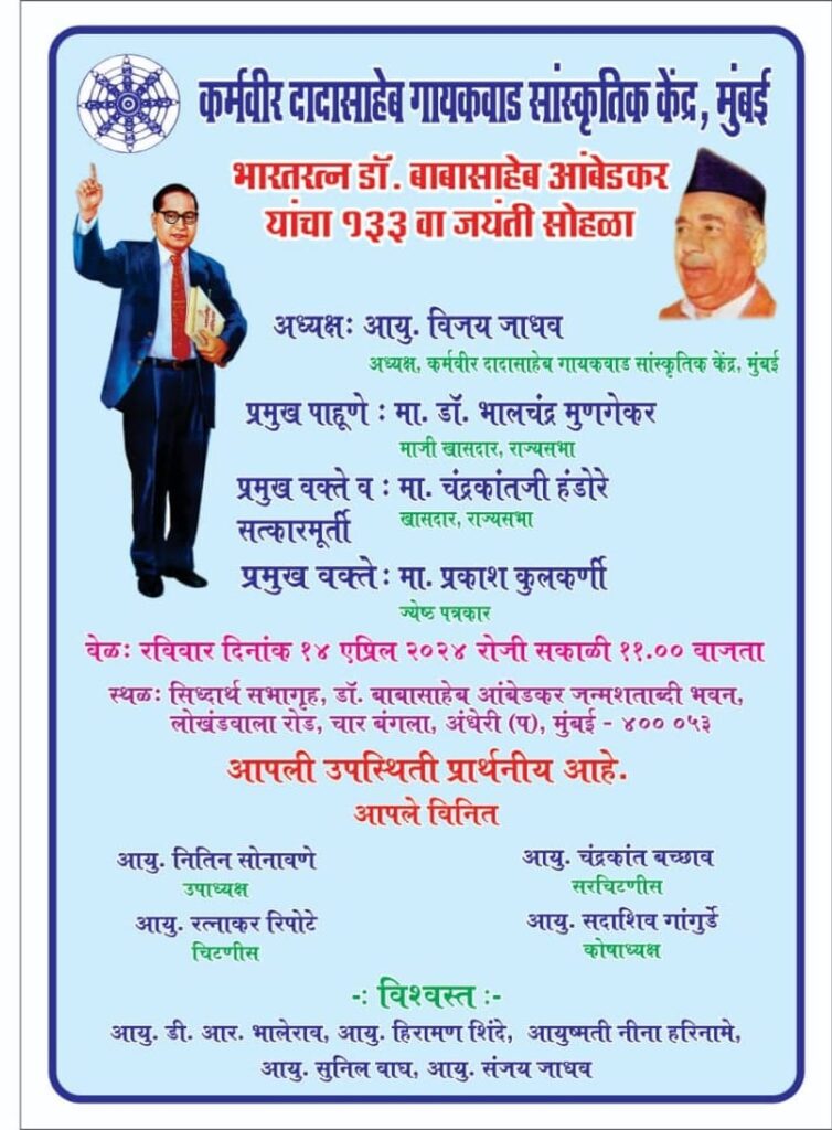 भारतरत्न डॉ. बाबासाहेब आंबेडकर यांच्या 133व्या जयंतीनिमित्त मुंबईतल्या कर्मवीर दादासाहेब गायकवाड सांस्कृतिक केंद्रातर्फे उद्या 14 एप्रिल रोजी सकाळी 11 वाजता अंधेरीच्या चार बंगला येथील सिद्धार्थ सभागृहात जयंती सोहळ्याचे आयोजन करण्यात आले आहे.