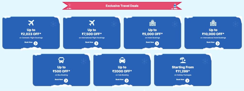 विंटर कार्निवल सेलदरम्यान पर्यटक ९ डिसेंबरपर्यंत कूपन कोड कार्निवल (CARNIVAL) चा वापर करत अविश्वसनीय सूटचा आनंद घेऊ शकतात. तुम्ही देशांतर्गत व आंतरराष्ट्रीय फ्लाइट्सवर अनुक्रमे जवळपास २,०२३ रूपयांची व ७,५०० रूपयांची बचत करू शकता, तसेच देशांतर्गत व आंतरराष्ट्रीय हॉटेल्सवर अनुक्रमे जवळपास ५,००० रूपयांची व १०,००० रूपयांच्या सूटचा आनंद घेऊ शकता. बस किंवा कॅबने प्रवास करण्याचे नियोजन करत असाल तर तुम्ही अनुक्रमे जवळपास ५०० रूपयांची व जवळपास २००० रूपयांची बचत करू शकता. तसेच संस्मरणीय हॉलिडेचा अनुभव घेणाऱ्यांसाठी पॅकेजेस् फक्त ११,२९९/- रूपयांपासून सुरू होतात.