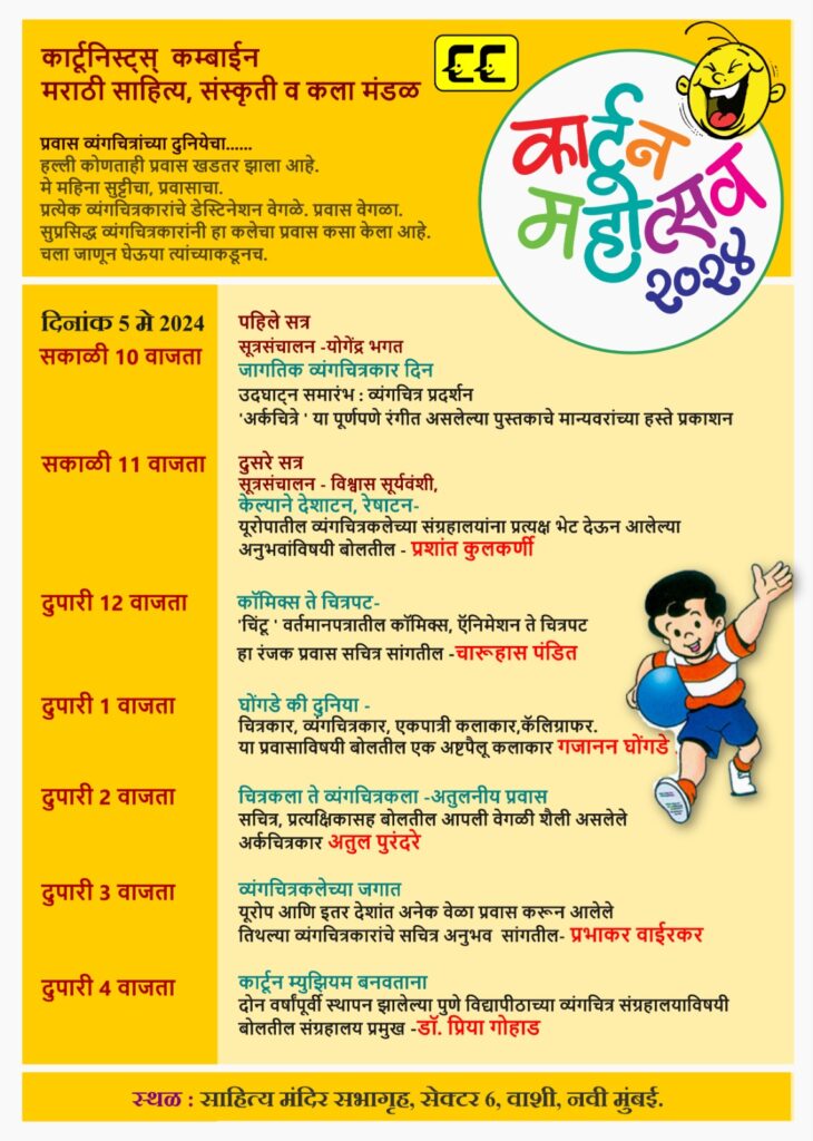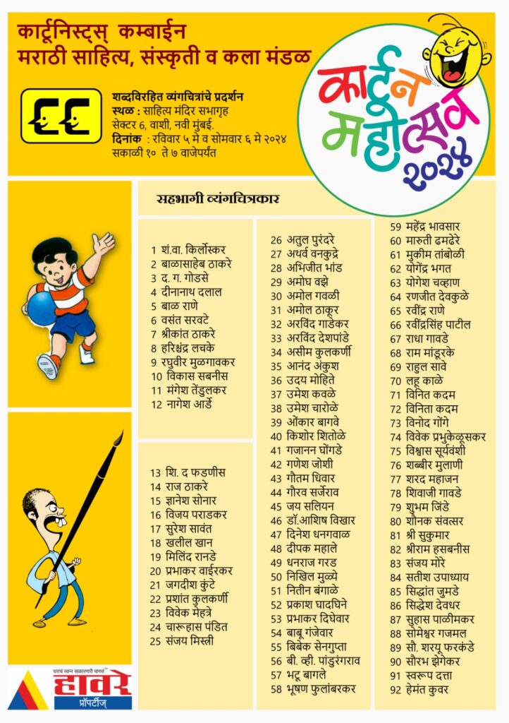 सकाळी दहा वाजल्यापासून संध्याकाळी सात वाजेपर्यंत चालणाऱ्या या कार्टून महोत्सवाला हावरे प्रॉपर्टीजने प्रायोजित केले आहे. या कार्टून महोत्सवात व्यंगचित्रकार शंभू किर्लोस्कर, बाळासाहेब ठाकरे, द. ग. गोडसे, दीनानाथ दलाल, बाळ राणे, वसंत सरवटे, श्रीकांत ठाकरे, हरिश्चंद्र लचके, रघुवीर मुळगावकर, विकास सबनीस, मंगेश तेंडुलकर, नागेश आर्डे, राज ठाकरे, ज्ञानेश सोनार, खलील खान, प्रभाकर वाईरकर, प्रशांत कुलकर्णी, ज्ञानेश सोनार, संजय मिस्त्री आदी ९२ व्यंगचित्रकारांची व्यंगचित्रे प्रदर्शित केली जाणार आहेत.