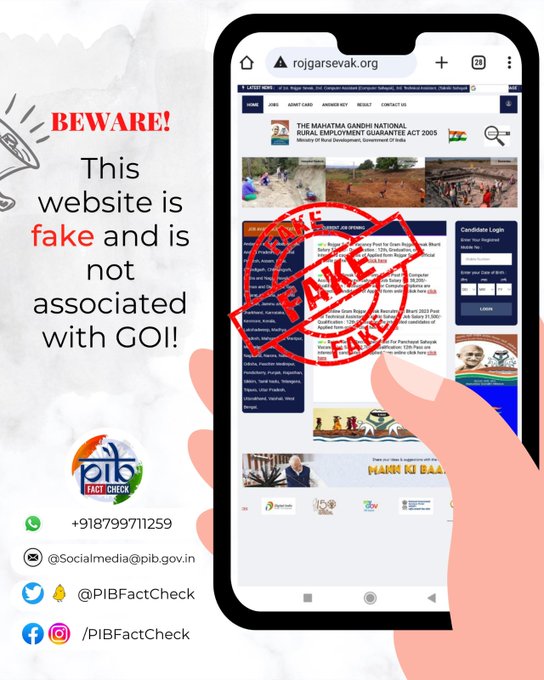 अलीकडेच केंद्रीय ग्रामीण विकास मंत्रालयाच्या निदर्शनास आले आहे की ग्राम रोजगार सेवक, संगणक सहाय्यक, तांत्रिक सहाय्यक आणि पंचायत सहाय्यक या पदांसाठी www.rojgarsevak.org या वेबसाइट/लिंक वर काही बनावट रिक्त पदांची जाहिरात करण्यात आली आहे. रिक्त जागा ‘मनरेगा’ च्या नावाने अपलोड केल्या जातात. तरूणांची फसवणूक होऊ नये म्हणून केंद्र सरकारने हे स्पष्टीकरण जारी केले आहे.