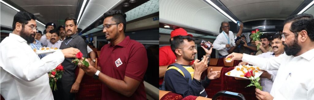 प्रधानमंत्री नरेंद्र मोदी यांनी आज सकाळी मडगाव ते मुंबईदरम्यान धावणाऱ्या वंदेभारत एक्स्प्रेसला हिरवा झेंडा दाखविला. त्यानंतर आज सायंकाळी वंदेभारत एक्स्प्रेसचे छत्रपती शिवाजी महाराज टर्मिनस येथे आगमन झाले. त्यावेळी मुख्यमंत्री शिंदे बोलत होते. यावेळी मुख्यमंत्री शिंदे यांनी वंदे भारत एक्स्प्रेसचे लोको पायलट व प्रवाशांशी संवाद साधत त्यांचे मिठाई आणि गुलाबपुष्प देवून स्वागत केले. यावेळी शालेय शिक्षण मंत्री तथा मुंबई शहरचे पालकमंत्री दीपक केसरकर, पर्यटन मंत्री मंगल प्रभात लोढा, खासदार राहुल शेवाळे, खासदार कृपाल तुमाने, आमदार यामिनी जाधव, मध्य रेल्वेचे महाप्रबंधक नरेश लालवाणी, मुंबई विभागाचे महाप्रबंधक रजनीश गोयल आदी उपस्थित होते.