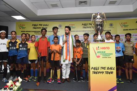 युवा व्यवहार आणि क्रीडा तसेच माहिती आणि प्रसारण मंत्री अनुराग ठाकूर यांनी नवी दिल्लीतील मेजर ध्यानचंद नॅशनल स्टेडियमवर हिरो एशियन चॅम्पियन्स ट्रॉफी, चेन्नई 2023 च्या प्रतिष्ठित करंडकाचे अनावरण केले. यावेळी त्यांनी ‘पास द बॉल ट्रॉफी टूर’ मोहिमेचा शुभारंभ केला.
