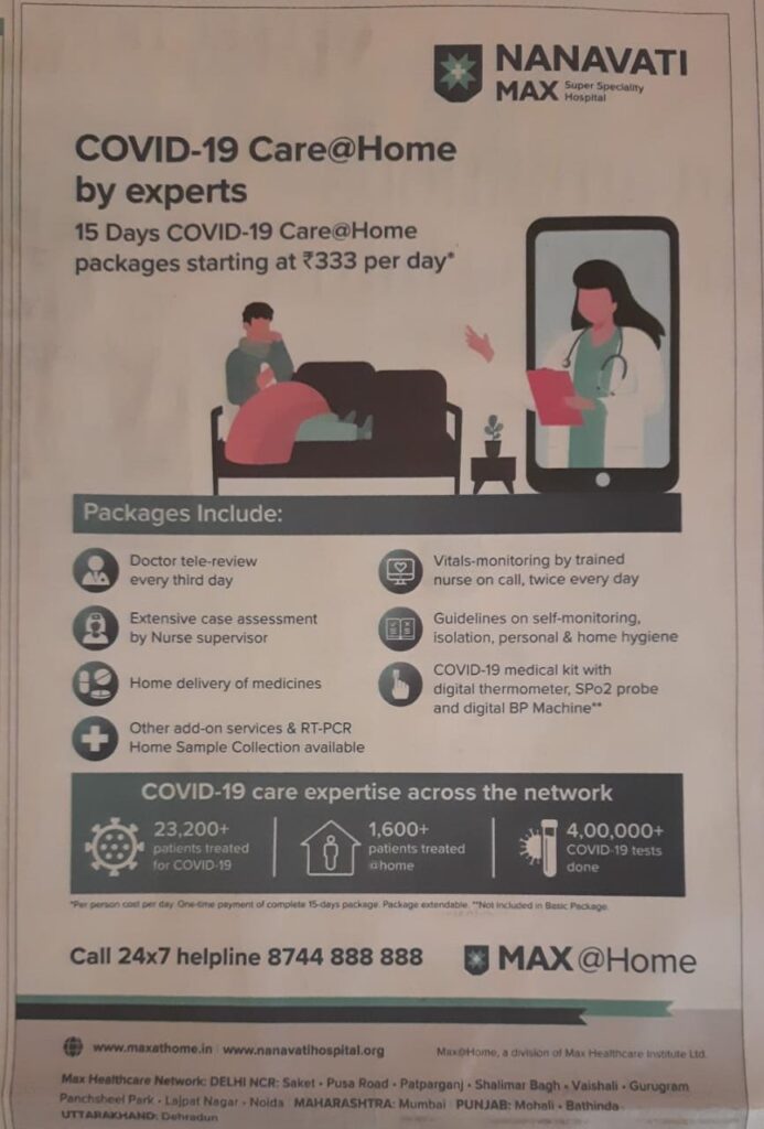 चार दिवसांपूर्वीच नानावटी मॅक्स सुपर स्पेशालिटी हॉस्पिटलने वृत्तपत्रांमध्ये जाहीरात देऊन कोविडच्या रूग्णांवर उपचार करण्याचे पॅकेज जाहीर केले आहे. १५ दिवसांचे हे पॅकेज ३३३ रूपये प्रतिदिन, या दरापासून सुरू होत आहे. या पॅकेजमध्ये दर तिसऱ्या दिवशी डॉक्टर टेलिफोनवर रूग्णाच्या प्रकृतीचा आढावा घेणार. दिवसातून दोन वेळा प्रशिक्षित नर्सकडून टेलिफोनवरून लक्ष देणार. नर्सकडून नियमित आढावा घेतला जाणार. रूग्णाला स्वतःची पडताळणी कशी करावी, विलगीकरणात कसे राहवे, तेथील स्वच्छता कशी असावी, याबद्दल मार्गदर्शन करणार. घरी औषधे पाठवणार. आरटीपीसीआर चाचण्यांसाठी घरून नमुने गोळा करणार. कोविड-१९चे वैद्यकीय किट (डिजीटल थर्मोमीटरसह) आणि रक्तदाब तपासण्याचे यंत्र देणे आदी सुविधा देण्यात येणार आहेत.