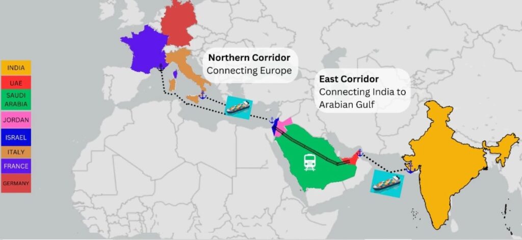 या संपूर्ण मार्गिकेत भारताला आखाती देशांशी जोडणारा सुरूवातीचा मार्ग आणि आखाती देशांना युरोपशी जोडणारा नंतरचा मार्ग यांचा समावेश आहे. यात सागरी-रेल्वेचे परस्पर पूरक वाहतूक जाळे आणि रस्ते वाहतूक मार्गांना सामावून घेतले जाईल.