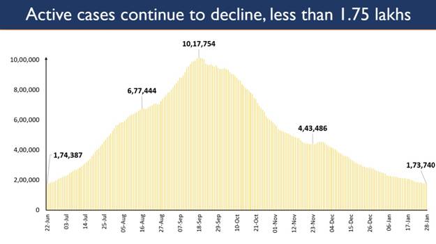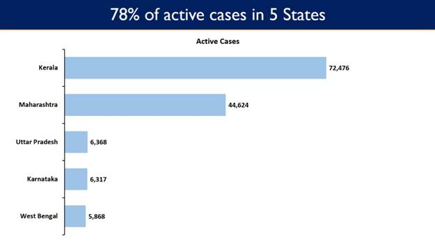 India’s total Active Caseload has dropped to less than 1.75 lakh (1,73,740) today. The active caseload now consists of just 1.62% of India’s total Positive Cases. 78% of the active cases are concentrated in five states viz. Kerala, Maharashtra, Uttar Pradesh, Karnataka and West Bengal.