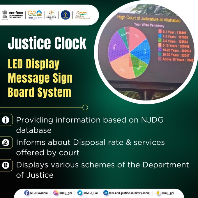 जस्टिस क्लॉक्स म्हणून ओळखल्या जाणारी इलेक्ट्रॉनिक निदर्शक प्रणाली उच्च न्यायालयांच्या  संकुलांमध्ये बसवण्यात आली आहे. हा उपक्रम संबंधित घटकांना न्यायालयाशी संबंधित महत्त्वाच्या मापदंडाबाबत माहिती देईल. तसेच न्यायालयाशी संबंधित आकडेवारी/माहिती प्रदान करून लोकांमध्ये जागरूकता आणेल.