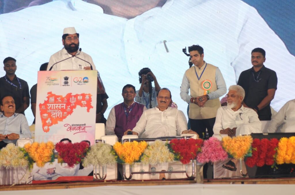 एसआरपीएफ मैदानावर ‘शासन आपल्या दारी’ अभियानातंर्गत धुळे जिल्हास्तरीय कार्यक्रमाचे उद्घाटन मुख्यमंत्री एकनाथ शिंदे यांच्या हस्ते करण्यात आले. त्यावेळी ते बोलत होते. याप्रसंगी उपमुख्यमंत्री अजित पवार, जिल्ह्याचे पालकमंत्री गिरीष महाजन, पाणीपुरवठा मंत्री गुलाबराव पाटील, बंदरे मंत्री दादाजी भुसे, मंत्री अनिल पाटील, खासदार डॉ. हीना गावित, जिल्हा परिषदेच्या अध्यक्षा अश्विनी पवार, आमदार किशोर दराडे, जयकुमार रावल, मंजूळाताई गावीत, काशीराम पावरा, चिमणराव पाटील, मंगेश चव्हाण, महापौर प्रतिभा चौधरी आदी मान्यवर उपस्थित होते.