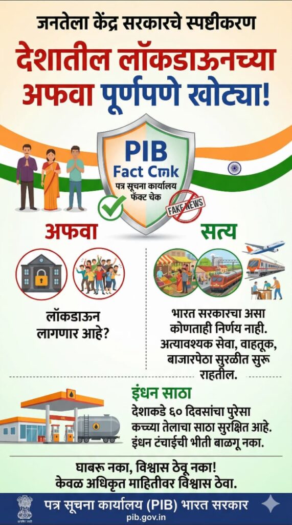 केंद्रीय मंत्र्यांनी नागरिकांना विनंती केली आहे की, सोशल मीडियावर येणाऱ्या अनधिकृत आणि संशयास्पद संदेशांना घाबरून जाऊ नका किंवा ते पुढे पाठवू नका. कोणत्याही महत्त्वाच्या धोरणात्मक निर्णयाची माहिती केवळ अधिकृत सरकारी वाहिन्या आणि ‘पत्र सूचना कार्यालय’ (PIB) यांच्या माध्यमातूनच दिली जाते. अफवा पसरवून समाजात भीती निर्माण करणाऱ्यांवर कायदेशीर कारवाई करण्याचे संकेतही प्रशासनाने दिले आहेत. सद्यस्थितीत देशातील सर्व अत्यावश्यक सेवा, वाहतूक, बाजारपेठा आणि उद्योग नेहमीप्रमाणे सुरळीत सुरू राहतील. नागरिकांनी आपले दैनंदिन व्यवहार करताना कोणत्याही प्रकारची भीती बाळगू नये. सरकार परिस्थितीवर लक्ष ठेवून असून जनतेच्या हितालाच सर्वोच्च प्राधान्य दिले जाईल, असे आश्वासन सरकारकडून देण्यात आले आहे.