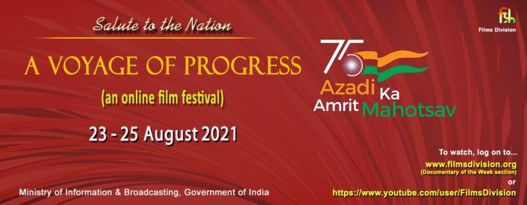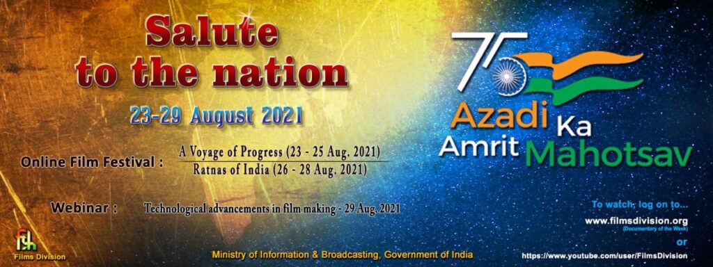 स्वातंत्र्याचा अमृतमहोत्सव साजरा करण्यासाठी माहिती आणि प्रसारण मंत्रालयाद्वारे विविध कार्यक्रमांचे आयोजन करण्यात आले आहे. याचाच एक भाग म्हणून फिल्म्स डिव्हिजनने ‘राष्ट्राला सलाम’ हा एक आठवड्याचा कार्यक्रम 23 ते 29 ऑगस्टदरम्यान आयोजित केला आहे. याअंतर्गत, ‘ए व्हॉयेज ऑफ प्रोग्रेस’ आणि ‘रत्नज ऑफ इंडिया’ या ऑनलाईन चित्रपट महोत्सवांचे आणि ‘कालौघात चित्रपट निर्मितीमध्ये तांत्रिक प्रगती’ या वेबिनारचे आयोजन करण्यात आले आहे.