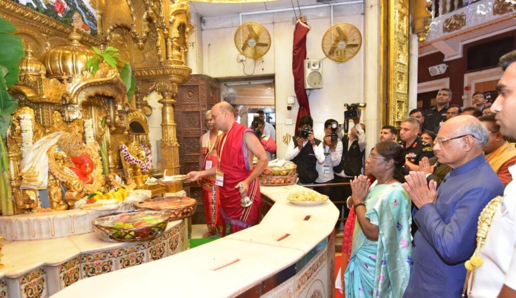 राष्ट्रपतींनी आज दुपारी श्री सिद्धिविनायक मंदिराला भेट दिली. यावेळी राज्यपाल रमेश बैसदेखील उपस्थित होते. श्री सिद्धिविनायक मंदिर न्यासाचे अध्यक्ष आदेश बांदेकर यांनी राष्ट्रपतींचे स्वागत केले. संध्याकाळी महाराष्ट्र शासनातर्फे त्यांचा राजभवन येथे नागरी सत्कार करण्यात येणार आहे.