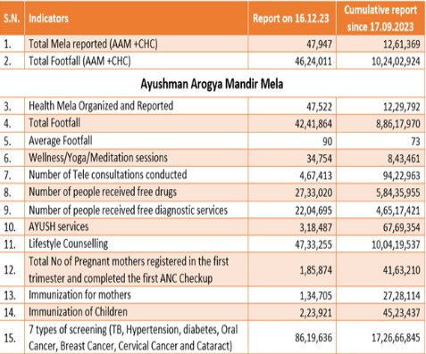 आयुष्मान भव कार्ड, आभा कार्डांची निर्मिती, आरोग्यविषयक महत्त्वपूर्ण योजना आणि असंसर्गजन्य रोग, क्षय, सिकल सेल आदी विविध रोगांविषयी जागरूकता निर्माण करण्यासाठी देशाच्या विविध भागांत 17 सप्टेंबर 2023 पासून आरोग्य मेळावे भरवण्यात आले. या काळात 17 कोटींपेक्षा जास्त (17,26,66,845) लोकांनी क्षय रोग, उच्च रक्तदाब, मधुमेह, मोतीबिंदू, तोंडाचा कर्करोग, स्तनाचा कर्करोग व गर्भाशयमुखाच्या कर्करोग आदी सात प्रकारच्या आजारांच्या चाचण्या करून घेतल्या आहेत. 16 डिसेंबर 2023 रोजी संपलेल्या आठवड्यात 86,19,636 लोकांनी या सात रोगांच्या चाचण्यांचा लाभ घेतला आहे.