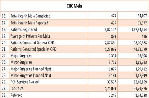 सामाजिक आरोग्य केंद्रांमध्ये 34,107 आरोग्य मेळावे भरवण्यात आले असून त्यामध्ये एकूण 1,37,84,954 लोकांनी नोंदणी केली.