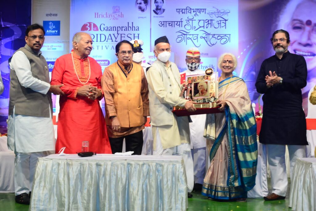 किराणा घराण्याच्या ज्येष्ठ गायिका डॉ. प्रभा अत्रे यांचा पद्मविभूषण पुरस्कार जाहीर झाल्याबद्दल राज्यपालांच्या हस्ते दीनानाथ नाट्यगृह येथे बुधवारी (दि. २३) सत्कार करण्यात आला, त्यावेळी त्या बोलत होत्या. हृदयेश आर्टतर्फे आयोजित या सत्कार सोहळ्याला राज्यपाल भगतसिंह कोश्यारी, पं. हरिप्रसाद चौरसिया, राज्याचे माजी मंत्री विनोद तावडे, आमदार पराग अळवणी, माध्यमकर्मी राजीव खांडेकर व हृदयेश आर्टचे अध्यक्ष अविनाश प्रभावळकर प्रामुख्याने उपस्थित होते.