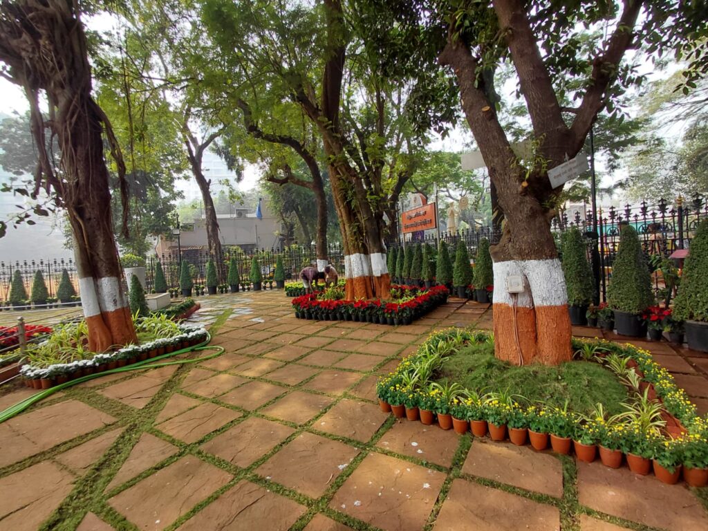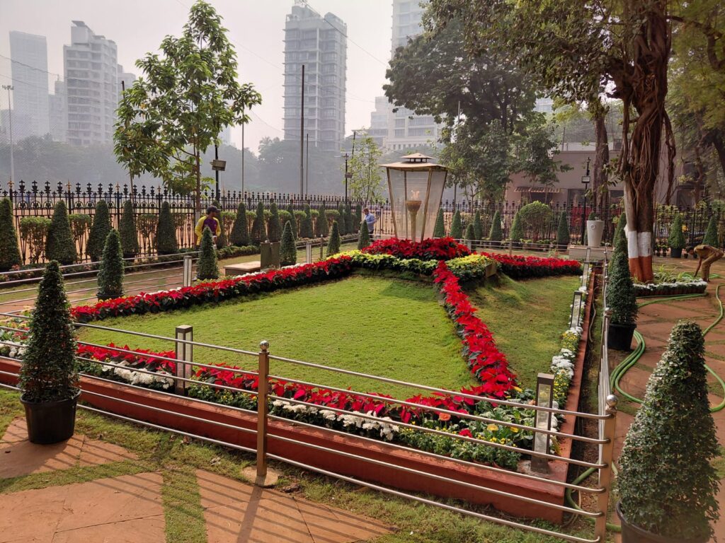 शिवसेनाप्रमुख बाळासाहेब ठाकरे यांच्या काल झालेल्या जयंतीनिमित्त मुंबई महापालिकेच्या उद्यान विभागाकडून दादरच्या शिवाजीपार्क येथील स्मृती स्थळावर विविध फुलझाडांनी तसेच शोभिवंत झाडांनी सजावट केली होती. उद्यान अधीक्षक जितेंद्र परदेशी यांच्या मार्गदर्शनाखाली ही मांडणी करण्यात आली. यामध्ये सफेद आणि पिवळ्या रंगाच्या शेवंती, झेंडू, विविधरंगी जरबेरा, पोइनसेटिया इत्यादी फुलझाडांचा वापर करण्यात आला. माल्फिजिया झाडाच्या टोपिअरी प्रकारातील कोन आकाराच्या कुंड्यांमधील झाडांचाही यात समावेश होता.