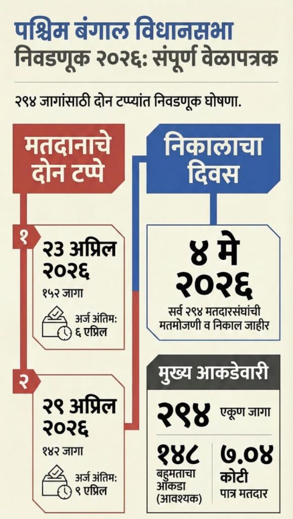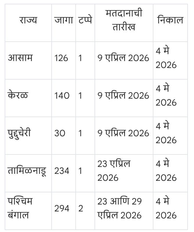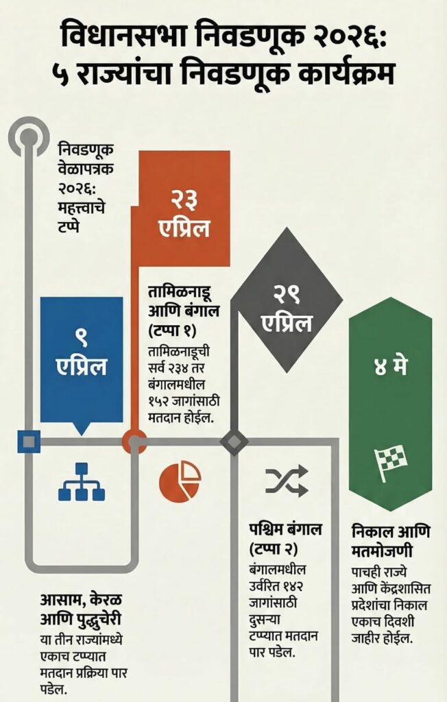 पश्चिम बंगालसह 5 राज्याxतील विधानसभा निवडणुका केंद्रीय निवडणूक आयोगाने रविवारी जाहीर केल्या. मुख्य निवडणूक आयुक्त (CEC) ज्ञानेश कुमार यांनी अधिकृत निवडणूक कार्यक्रमाची घोषणा केली. त्यानुसार, केरळ, पुद्दुचेरी, आसाममध्ये एकाच टप्प्यात 9 एप्रिल रोजी, तर तामिळनाडूतही 23 एप्रिल रोजी एकाच टप्प्यात मतदान होईल. पश्चिम बंगालमध्ये 23 व 29 एप्रिल रोजी 2 टप्प्यात मतदान होईल. पाचही राज्यात एकाच दिवशी 4 मे रोजी निवडणूक निकाल घोषित केले जातील. या पाच राज्यांमध्ये सुमारे 17.4 कोटी मतदार आपल्या मतदानाचा हक्क बजावतील. मे आणि जून 2026मध्ये या विधानसभांचा कार्यकाळ संपुष्टात येत असल्याने ही महाप्रचंड प्रशासकीय आणि सुरक्षाविषयक प्रणाली राबवली जात आहे. केवळ निवडणुका घेणे हा उद्देश नसून, संघराज्य चौकटीत राज्यांचे स्वायत्त महत्त्व पुन्हा अधोरेखित करणे, हा या प्रक्रियेचा मूळ गाभा आहे, असे मुख्य निवडणूक आयुक्तांनी यावेळी स्पष्ट केले.