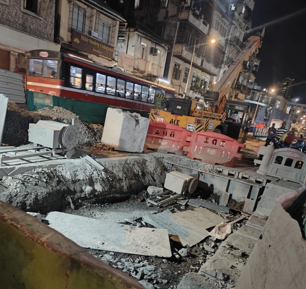 छायाचित्रात दिसणारा हा प्रचंड मोठा हौद गिरगाव येथील प्रसिद्ध गोरा राम व काळा राम मंदिराच्या अगदी मध्यभागी असलेल्या झावबावाडीच्या तोंडावरच आहे. अजूनही या परिसरात वाहतूक एकदिशा मार्ग पद्धतीनेच होत आहे. इतकेच नव्हे तर ऑपेरा हाऊस, प्रार्थना समाज, गिरगाव (झावबावाडी), चिरा बाजार, मेट्रो सिनेमा, हॅन्डलूम हाऊस, हुतात्मा चौक आदी अनेक स्थानकांचे काम काहीसे अर्धवट झालेले दिसते. काही स्थानकांचा एकच मार्ग खुला झालेला दिसतो. हुतात्मा चौकातील सरु न झालेल्या एका जिन्याला चक्क ‘टोपरे’ घालून झाकून ठेवले आहे. चिरा बाजार येथे तर अजूनही काही ठिकाणी गळती होत असते, या शंकेने अभियंते पाहणी करताना दिसतात.