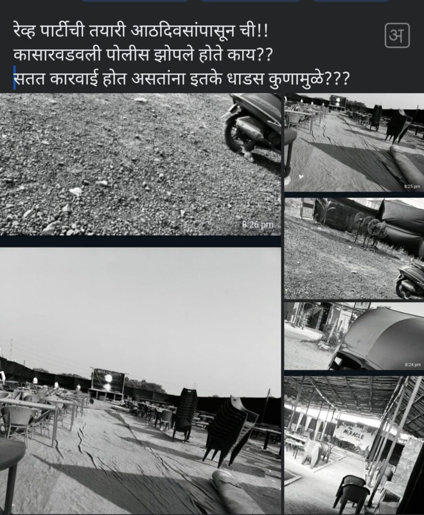 आता पुन्हा पार्टीकडे.. तर इतका जामानिमा असलेली मोठ्या पार्टीची जमवाजमव करण्यात किमान आठ दिवस तर गेलेच असतील. इतक्या खुर्च्या-टेबले, लाईटव्यवस्था वगैरे करण्यास काही दिवस तर लागले असणारच. मग हे सर्व कासारवडवली पोलिसांसमोर घडत असताना पोलिसांनी काय डोळे बंद करून घेतले होते, की ते झोपलेले होते? याची उच्चस्तरीय चौकशी होणे गरजेचे आहे. तेथे एक रेस्ट्रो बारही आहे. निदान तशी पाटी तरी आहे. हा बार कळीचा मुद्दा आहे. तो अधिकृत आहे की नाही येथपासून शंका सुरू होतात. तेथील अनेक मजुरांनी या बारमध्ये शुक्रवार, शनिवारी बराच धिंगाणा चालतो, असे सांगितले.